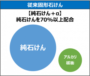 見た目は似ていますが、従来の固形石けんとは異なり、複数の界面活性剤や補助剤を組み合わせることで、様々な汚れに効果的に働き、総合的に高い洗浄力を叶えることができます。